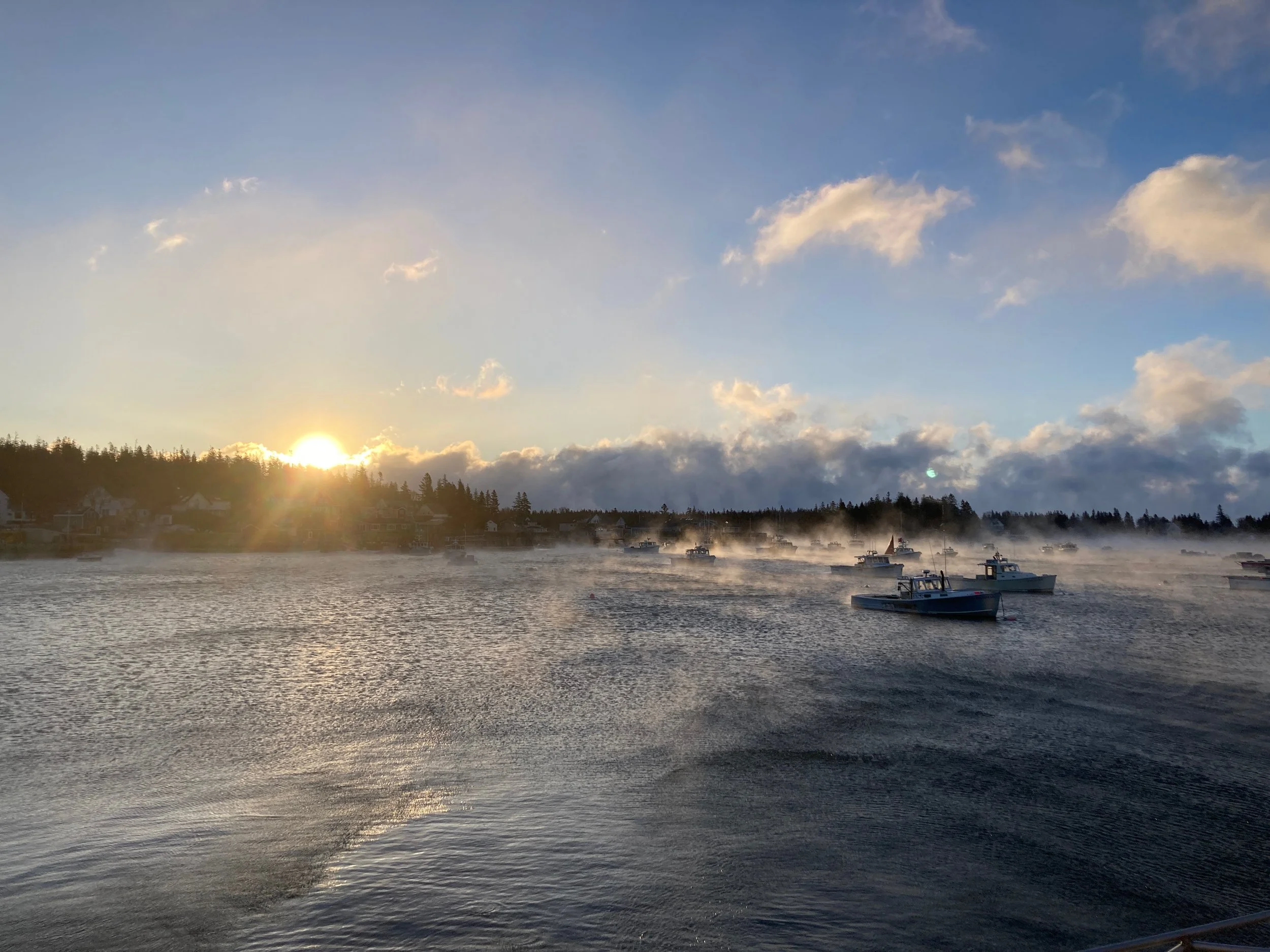 On the coldest day of the year I caught the sunrise at the harbor that simmered like a cauldron in the frigid wind. The lobster boats, all pointing in the same direction, strained on their moorings while also being at rest. The sea smoke made the cold ocean appear to be on fire, another paradox of days like this. I was not out there for long before my face and hands hurt too much to stay.